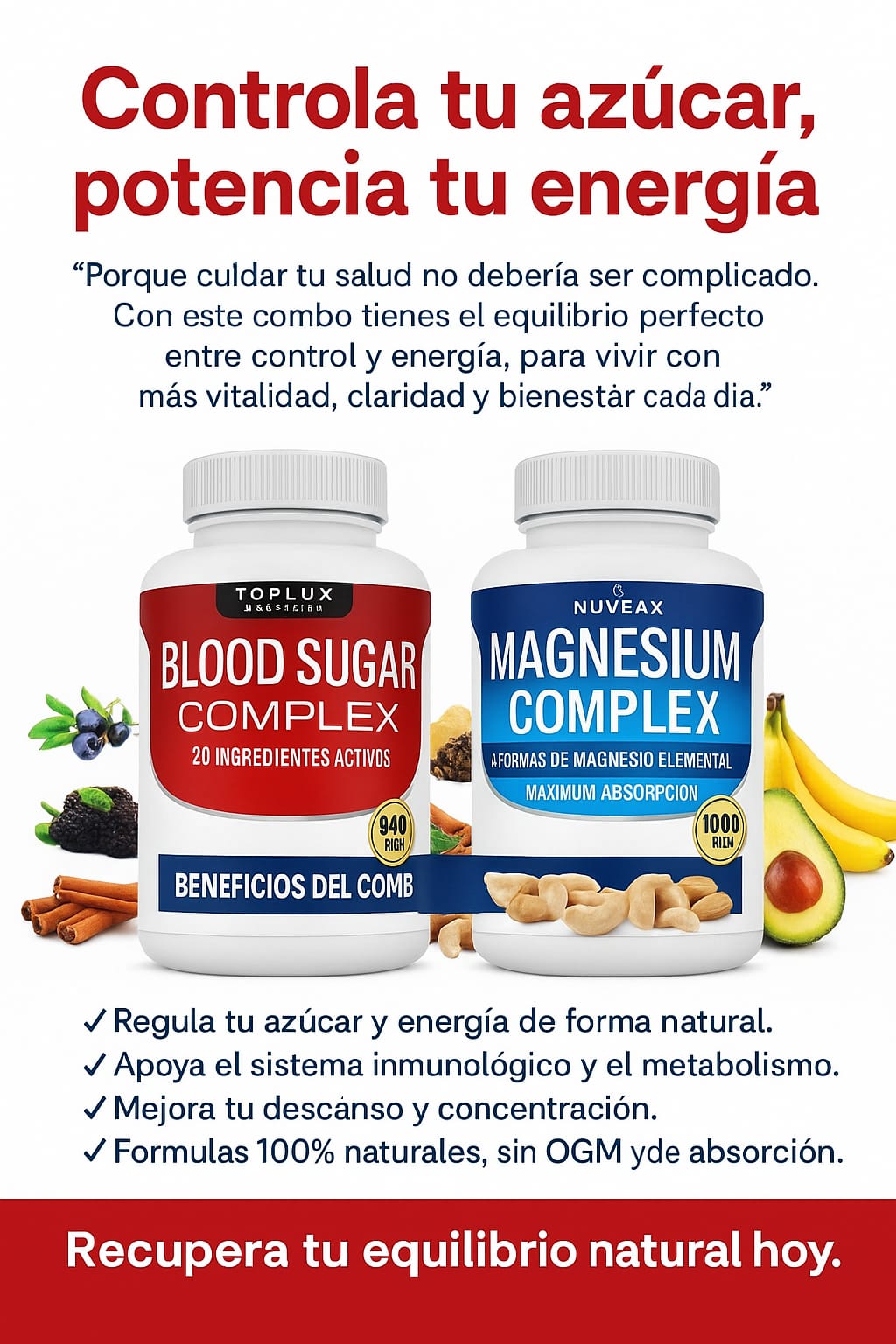 Recupera el centro de tu bienestar con el Combo Equilibrio Vital, una alianza poderosa diseñada para sanar desde adentro. Este dúo combina el Blood Sugar Complex, con 20 ingredientes naturales para mantener tus niveles de azúcar en armonía, y el Magnesium Complex, con 8 formas de magnesio para una absorción máxima. 🔴🔵