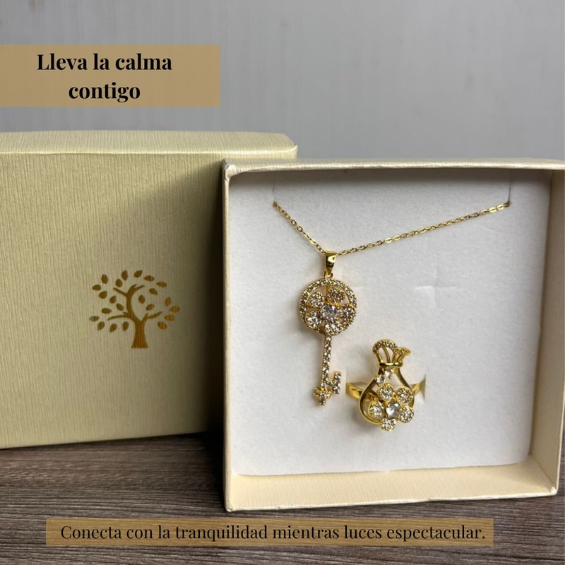 El set incluye un anillo ajustable para tu total comodidad y una cadena con broche resistente, ideal para elevar cualquier estilo, desde el uso diario hasta tus eventos más especiales. Lleva contigo la llave de tu propia felicidad y permite que tu luz interior brille con fuerza inagotable.